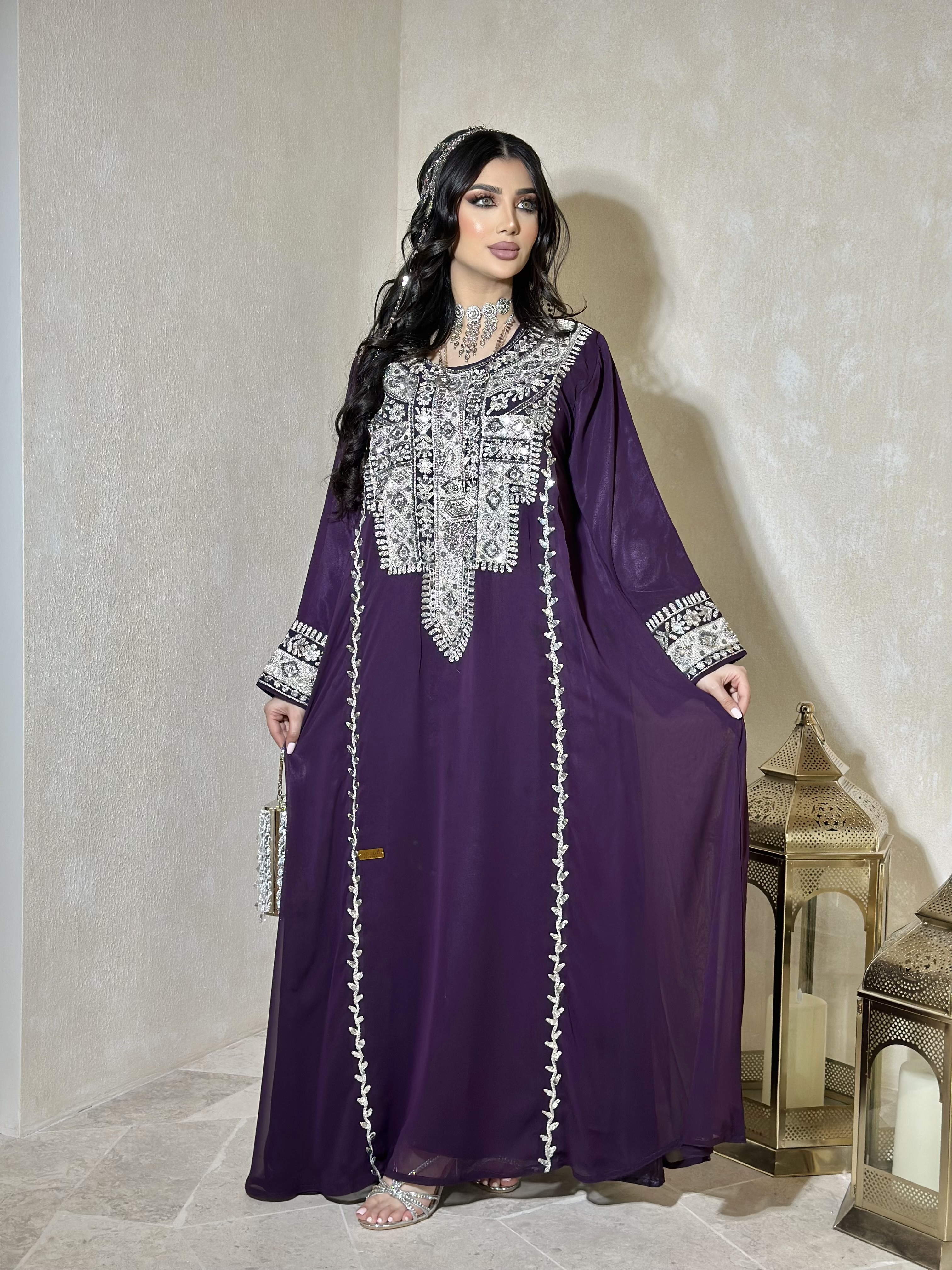 لبسة انيقه وفخمة تقليدي مطور خام شيفون بقصة كلوش شغل تطريز يدوي مع فولك وخرز بالاضافه الى شيله عليها تطريز موزع